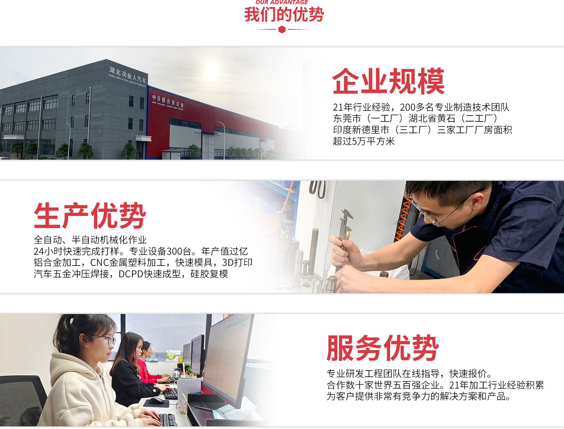 工業(yè)人從二十年前的純手工作坊,逐步發(fā)展成全自動(dòng)、半自動(dòng)機(jī)械化作業(yè)。從20年前的幾名員工,發(fā)展成今天80多名工業(yè)設(shè)計(jì)工程數(shù)據(jù)輸出專業(yè)隊(duì)伍,200多名專業(yè)制造技術(shù)團(tuán)隊(duì)。公司現(xiàn)有德國,日本,意大利等國際知名品牌先進(jìn)制造設(shè)備共500余臺,設(shè)備分別有進(jìn)口大型五軸CNC,2000...